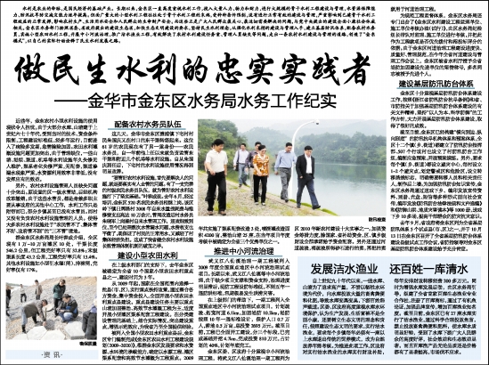 水利是农业的命脉,是国民经济的基础产业。长期以来,金东区一直高度重视水利工作,投入大量人力、物力和财力,进行大规模的骨干水利工程建设与管理,水资源保障能力、防汛抗旱防灾减灾能力逐年提高。但面广量大的小型水利工程往往处于骨干水利工程的末端,受种种条件限制,没有进行正常有效的建设与管理,严重影响到已建骨干水利工程效益的正常发挥,影响农村生产、生活用水安全和人民群众的生命财产安全。而这些正是广大人民群众最关心、最迫切需要解决的问题,与党中央提出的建设全面小康社会休戚相关。金东区水务部门按照省委、省政府提出的建设生态省,加快生态文明建设的要求,坚持民生水利理念,从强化水利末梢的建设与管理入手,建立基层防汛体系,配备农村水务员,实施小型农田水利工程,开展中小河流治理,推广洁水渔业工程,有效解决了农村水利建设任务重、管理人员缺失等问题,走出一条农村水利建设与管理的道路,创造了“金东模式”,以自己的实际行动诠释了民生水利发展之路。