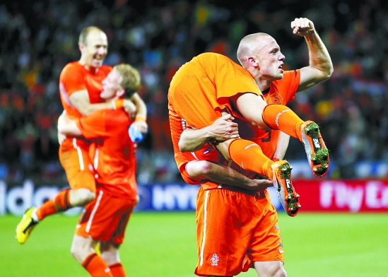 荷兰队球员海廷加(右)与队友庆祝胜利。 新华社发