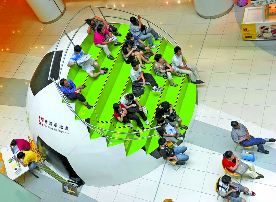 北京商场开设世界杯球迷专区,坐在“足球”里看足球惬意无比。东方IC供图