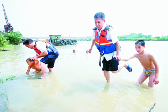 7月6日,德清县地方海事处执法人员在白三线航道石塘渡桥边,发现多名外来少年儿童在水深3米多的航道上游泳,立即劝导孩子们上岸。倪立芳 凌翔 摄