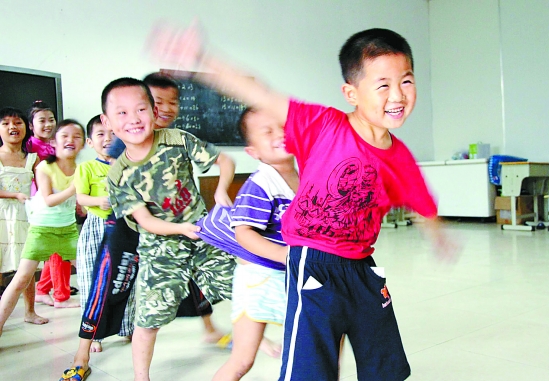 7月6日,绍兴县伟乐服饰公司外来工子女托管班上,20来个孩子正在做老鹰捉小鸡游戏。记者 金敖生 摄