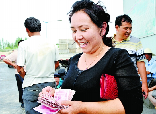 轮台县铁热克巴扎乡果农哈丽旦姆,开心地在清点杏子款。