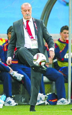 左图为西班牙队主帅博斯克在对阵瑞士队的小组赛中场边停球的动作。
