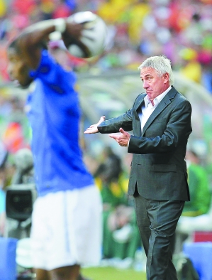 右图为荷兰队主帅范马尔维克在对阵巴西队的四分之一决赛中场边指挥。