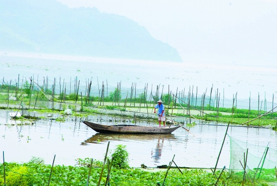 7月10日,洪水还没退去,建德市梅城镇沿江渔民就忙着检查鱼塘,抢修渔具。 宁文武 摄