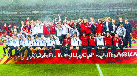 7月10日,德国队球员和工作人员在颁奖仪式后合影。新华社记者 邢广利 摄