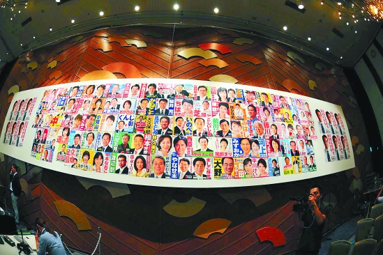 7月11日,在日本首都东京民主党竞选总部,媒体记者在民主党候选人的宣传画前忙碌。 新华社记者 季春鹏 摄
