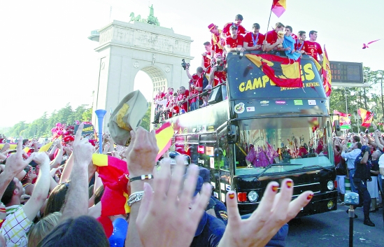 7月12日,新科世界冠军西班牙队球员乘坐敞篷大巴在马德里进行游行庆祝。 新华社发
