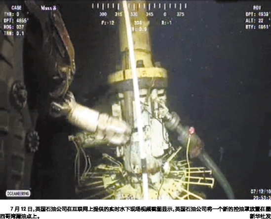 7月12日,英国石油公司在互联网上提供的实时水下现场视频截图显示,英国石油公司将一个新的控油罩放置在墨西哥湾漏油点上。 新华社发