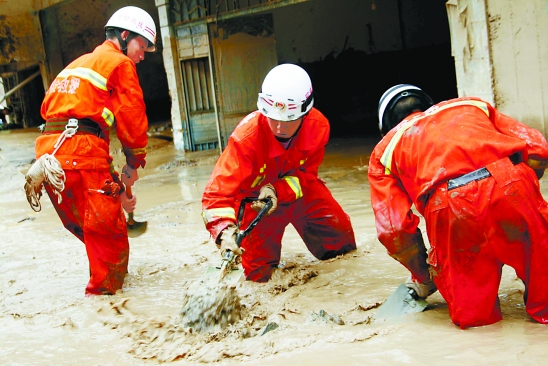 图为消防人员在清理洪灾现场。新华社发(张广玉 摄)