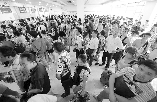 杭州城站火车站售票厅,很多人买不到火车票。今年暑运叠加了世博客流,导致长短途火车票全面吃紧。当天去买到上海的动车票,基本上只剩无座票,双休日的车票则需要提前一周购买。 本报记者 潘海松 摄