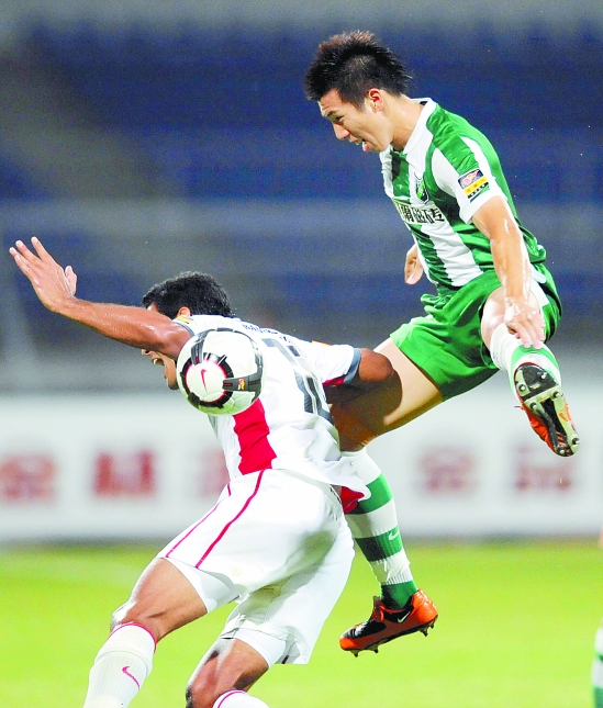 7月14日,杭州绿城队球员吴伟超(右)与长春亚泰队球员里卡多拼抢。当日,在中超联赛第12轮比赛中,杭州绿城队客场以4比3战胜长春亚泰队。