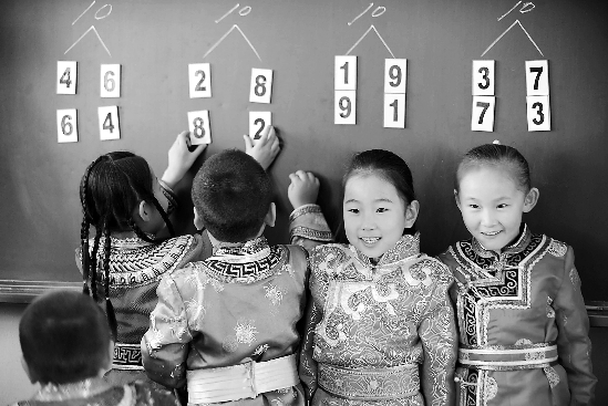 图为内蒙古锡林郭勒盟西乌珠穆沁旗蒙古小学一年级学生在数学课上。 新华社记者 张领 摄