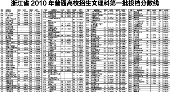 浙江省2010年普通高校招生文理科第一批投档分数线