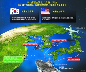 5月20日,在韩国联合调查团宣布“天安”号警戒舰是“因遭受朝鲜小型潜艇鱼雷攻击而沉没”的调查结论后,韩国政府5月24日宣布,6月初与美国在韩国西部海域(即黄海)举行联合军演,“乔治·华盛顿”号航母参加。韩美这一举动引起中国的强烈反对,韩美随后多次宣布推迟这一演习。