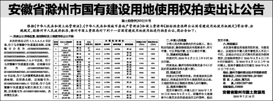 安徽省滁州市国有建设用地使用权拍卖出让公告