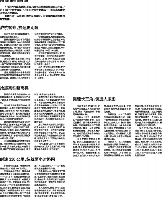 7月的天气越来越热,浙江乃至长三角的高铁热也在升温。7月1日沪宁客专通车,7月6日沪杭客专铺轨……浙江高铁建设开始进入收获期。