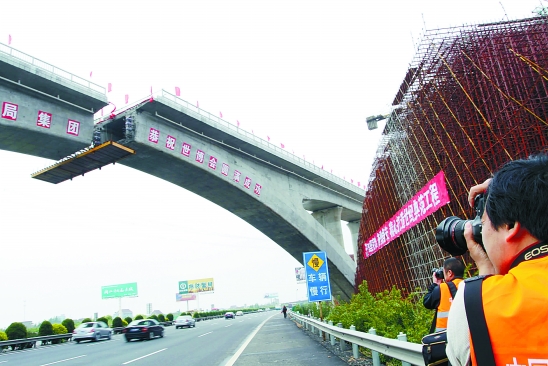 5月17日,沪杭高铁嘉善段跨沪杭高速自锚上承式拱桥成功转体合龙。