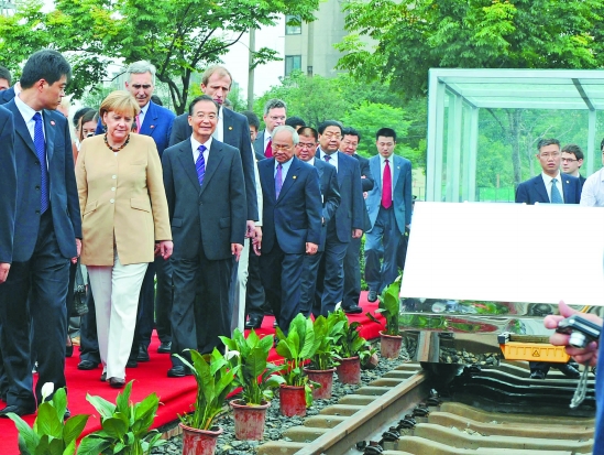 7月17日,温家宝与默克尔在西安参观中德合资西门子信号有限公司。 新华社记者 焦卫平 摄