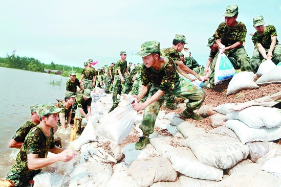 昨日下午,江西九江县新洲大坝6号桩出现泡泉和滑坡现象,驻浙某部300余名官兵迅速赶往现场处置,一个多小时就排除了险情。 牛冬 骆红军 摄