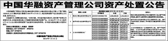 中国华融资产管理公司杭州办事处拥有对绍兴万事达纺织有限公司等3户资产债权13029.92万元(债权利息计算截至2010年4月20日)。我办拟将该资产包以协议转让方式处置,现予以公示。