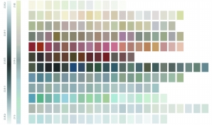 墙面色彩规划总谱包括灰蓝绿系、无彩系、暖米灰系、黄色系、灰红色系和粉赭系,共6个色系。