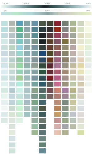 点缀构件色彩规划总谱包括灰绿色系、灰蓝色系、无彩色系、黄褐色系和灰赭红系,共5个色系。