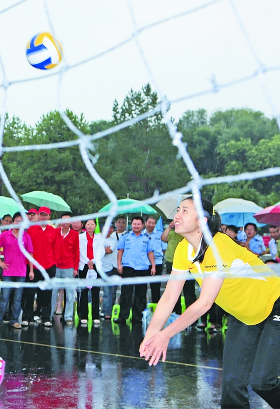 7月23日,前女排国手周苏红和群众一起打排球。 新华社记者 相梅 摄