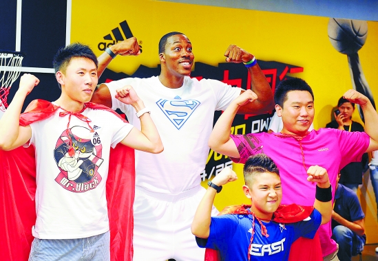 7月25日,霍华德(左二)与三名球迷一起模仿超人的动作。当日,NBA球星德怀特·霍华德在沈阳参加见面会活动,与球迷们“亲密接触”。