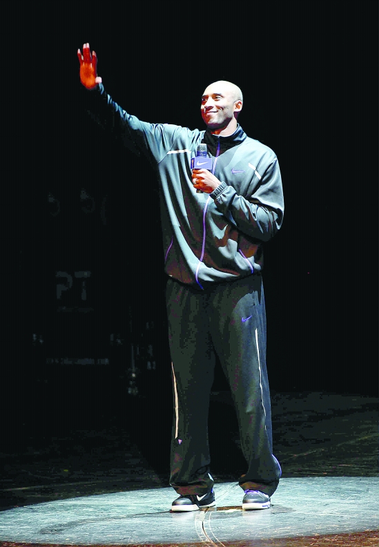 7月26日,NBA洛杉矶湖人队球星科比·布莱恩特在球迷见面活动上向球迷挥手致意。当日,科比北京球迷见面活动在北京世纪剧院举行,从而开启了科比2010年中国之行。 新华社记者 孟永民 摄