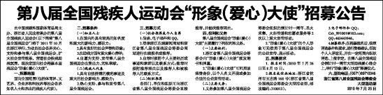 由中国残联和国家体育总局主办、浙江省人民政府承办的第八届全国残疾人运动会(以下简称“第八届全国残运会”)将于2011年10月在浙江举行。为动员社会各界关心、支持和参与第八届全国残运会,扩大社会宣传效果,营造社会扶残助残氛围,现决定面向社会招募本届残运会“形象(爱心)大使”。