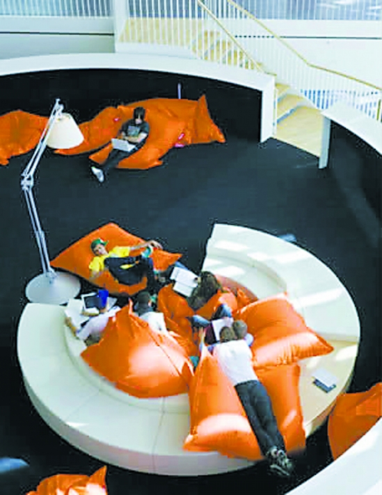 看看坐落于哥本哈根的郊区的高中校园吧,很难想象有人会不想去这里上学。这是一个完全开放式的高中,教学楼采用现代化的设计,明艳色调的彩色玻璃,可以随着太阳自动旋转的彩色窗户……整栋楼看上去就像一个玩具大盒子。而内部更是惬意:梦幻般的旋转楼梯、学生休息室的平台上提供大大的橙色枕头,学生可以坐着躺着趴着,绝对释放压力。