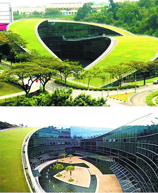 | 这是全球屈指可数的绿化屋顶教学楼建筑。它是新加坡的南洋理工大学艺术设计媒体学院的教学大楼,从远处望去,很难看出这是一座5层楼结构的建筑物,因为无论是颜色还是造型,它都与周围的环境完美融合。大楼采用了大量的玻璃幕墙装饰,可以为室内提供充足的自然光照明,草地屋顶为学生们提供了很好的会议场地。此外,绿色屋顶采用了绝缘材料,绝热降温的同时还可以收集雨水灌溉周围的植物。 |