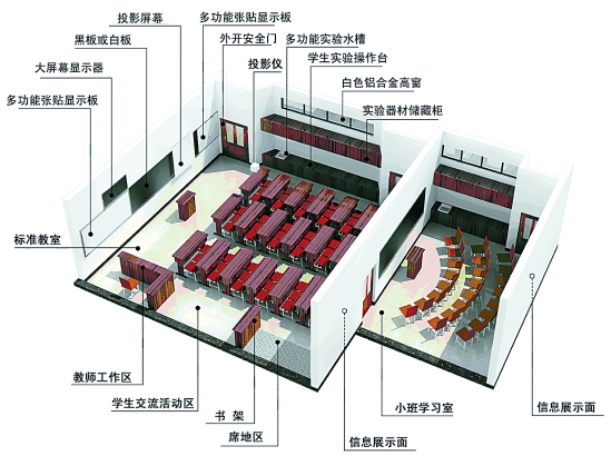 | 新建兰按照“未来学校”的理念,以“一大二小”班级教室配置的组合模式超前规划。 建兰中学的学习空间设计是开放多元而充满活力的。教室按一大二小予以配置。每班配备1间约90平方米标准教室,2间约30平方米小教室,可灵活分割且在闭合时做到隔音良好;除门窗以外的墙面中部均为展示面,有“多媒体展示平台”,为每一个学生提供计算机使用环境和上网环境;教室的声、光、热环境具有较高的可控性;标准教室是多功能学习空间,能满足各学科的教学要求,可大班授课,也可研究性学习。有操作区和教师工作区,设地台或席地阅读区。小教室平面布置满足24人左右规模的小班教学要求,座位形式可灵活布置,有利于开展需要更多交流的课程学习。 |