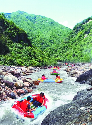 皮筏先在平静的溪潭中慢慢地漂着,身边的游客都开始拿起皮筏中的桨打起了水仗,船桨不停地拍打着水面,溅起的水花像调皮的精灵扑到人们的身上,不一会儿,身上就透心凉了。我们紧跟着前面的皮筏,来到一个落差5米的下道口,耳边听着前面的游人在滑下去那一瞬间的尖叫声,我的心也开始悬了起来。眼看着水流把我带到了落差口,我双手紧紧抓着皮筏上的握柄,一动都不敢动。随着一阵尖叫声和拍打在身上的浪花,皮筏上下翻腾,不停地撞击着沿途的石头,溅起的巨大水花不断飞进了皮筏中。清凉的溪水顿时就把我的身体和我的心给冰住了,此时所有的暑气和燥热早被抛到九霄云外去了……