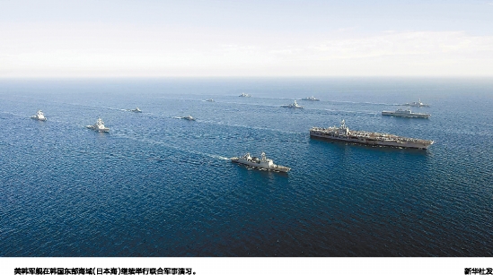 美韩军舰在韩国东部海域(日本海)继续举行联合军事演习。 新华社发