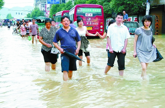 昨日,受暴雨影响,温岭市区积水严重,最深处超过一米,市民在积水中步行上班。温岭日报记者 刘振清 摄