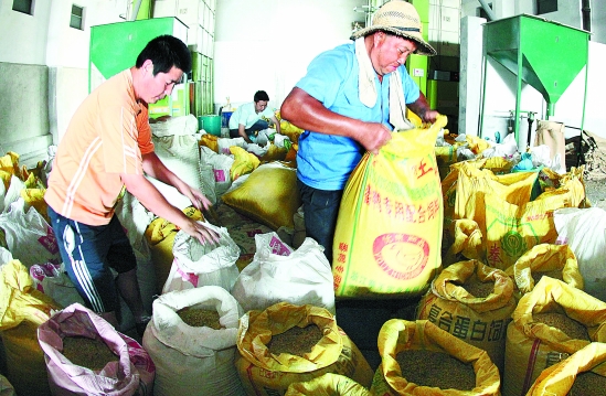昨日,宁波江北区慈城镇新华村陆银土等种粮大户在胜利粮站将潮湿的早稻谷倒进烘干机。该镇及时为种粮大户开启大功率粮食烘干机7台,昼夜作业,每日烘干稻谷40余吨。胡建华 吴红波 包和平 摄