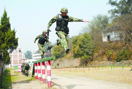 武警部队十大忠诚卫士候选人、温州支队反恐分队队长许越峰与反恐队员一起训练。方庆任 摄