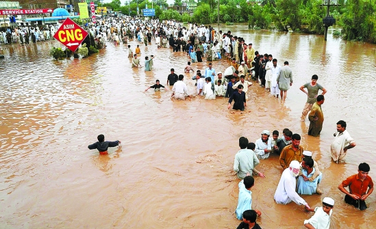 7月30日,在巴基斯坦白沙瓦,人们在洪水中转移。