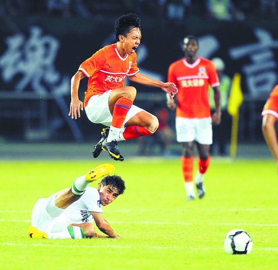 | 7月31日晚,中超足球联赛第16轮赛事展开,杭州绿城队主场对阵半程冠军山东鲁能队,鲁能队新援莱昂在第40分钟助攻邓卓翔破门,第60分钟汪嵩斜传造成鲁能队外援卡洛斯乌龙,第64分钟绿城队拉米雷斯捅射空门完成逆转。第78分钟绿城队埃米尔·马丁内斯因肘击对手被红牌罚下。最终杭州绿城队在主场以2比1逆转山东鲁能队,结束了两连败。 图为杭州绿城队队员巴力(下)铲断山东鲁能队队员张弛的突破。 新华社发 |