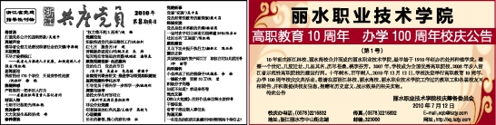 10年前由浙江林校、丽水商校合并而成的丽水职业技术学院,最早始于1910年创办的处州种植学堂。整整一个世纪,几度迁址、几易其名,历尽苍桑,桃李芬芳。2007年,学校成为全国优秀高职院校,2008年步入浙江省示范性高职院校的建设行列。十年树木,百年树人,2010年12月12日,学校决定举行高职教育10周年、办学100周年校庆庆典活动。敬请在原浙江林校、丽水商校、丽水职业技术学院工作过的教职工和各届校友互相转告,并积极提供校友信息,捐赠有历史意义、展示效果的相关实物。