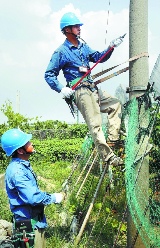 昨日,长兴县供电局党员支农服务队架线工冒酷暑抢修供电线路。当日,长兴气温近40℃。