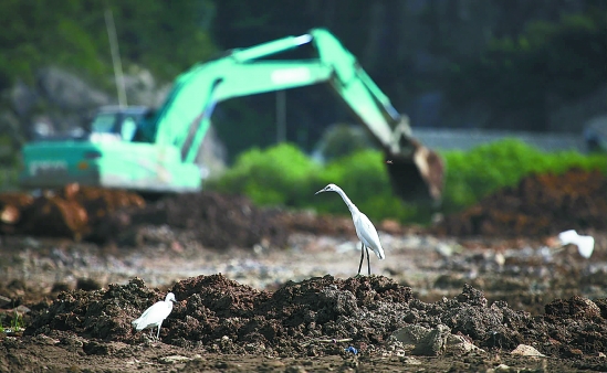 8月2日,笔者在乐清市一建筑工地水坑旁看到有多只白鹭在觅食。这里是它们曾经的家园。经济发展与生态保护的冲突能不能不再无奈地延续?张联喜 摄