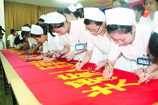 8月2日,杭州市第三医院举行医德宣誓活动,49名新进医护人员在廉洁行医签名横幅上一一签名。