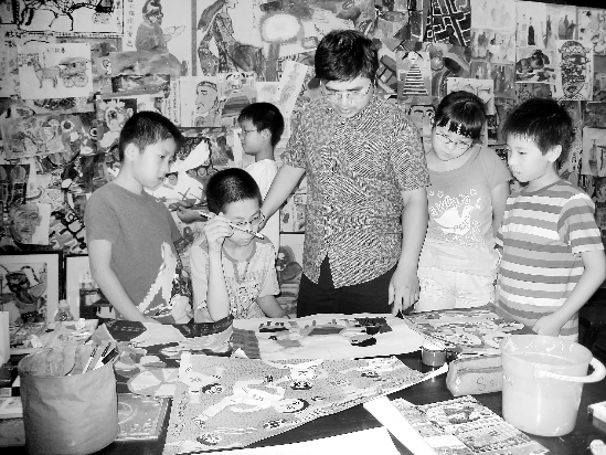 日前,杭州下城区青少年活动中心邀请省内教育专家,为辖区内中小学生开展绘画、摄影、书法等学习交流活动。图为省美术特级教师朱国华老师正在评点学生的美术作品。 通讯员 李琦 摄