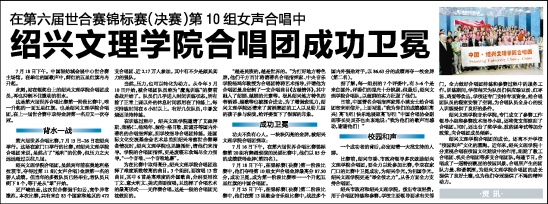 第六届世界合唱比赛,7月15日~26日在绍兴举行。这场在家门口举行的比赛,对绍兴文理学院合唱团来说,虽然占了“地利”的优势,但压力之大远远超过以往几届。