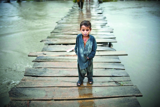 8月7日,在巴基斯坦白沙瓦市郊的一个村庄,一名儿童走过木板桥。 新华社发