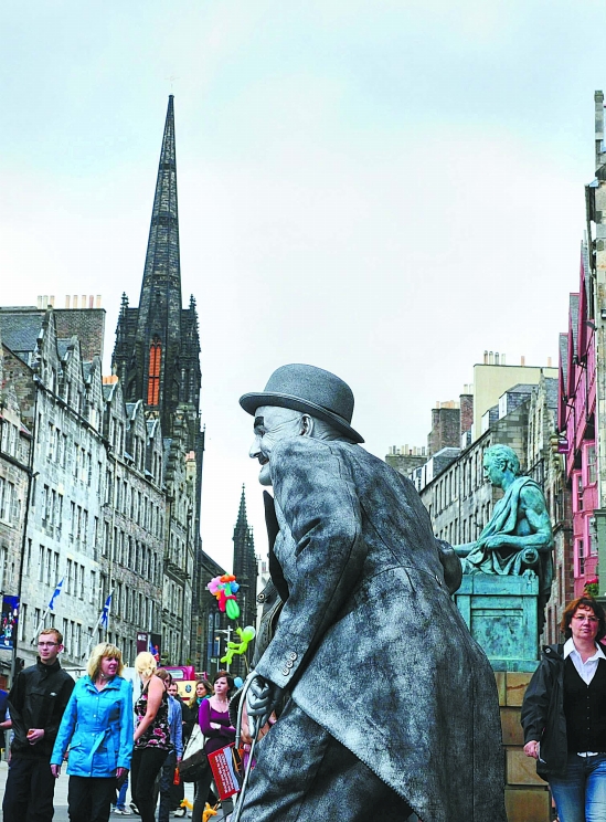 8月6日,在英国苏格兰首府爱丁堡“皇家英里”街头,一名男子扮成著名演员卓别林为路人表演。爱丁堡八月艺术季中规模最大的边缘艺术节于当天开幕。新华社发