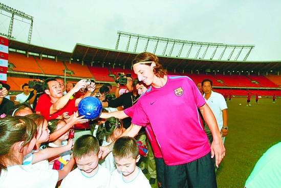 | 8月7日晚,参加奥迪2010巴萨中国行活动的西甲冠军巴塞罗那俱乐部的全体球员,在北京工人体育场与22名接受“奥迪童梦圆”项目捐助的四川绵竹地震灾区的儿童共度一个足球之夜。通讯员 张强 金新 摄 |